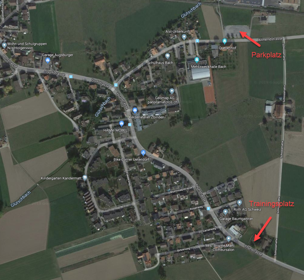 Der Trainingsplatz befindet sich in Uetendorf (direkt neben dem Gebäude an der Thunstrasse 55). Ein grosser Parkplatz ist vis-à-vis der Allmendstrasse 36 zu finden. Die Strecke vom Parkplatz zum Trainingsplatz ist in max. 10 min erreichbar und eignet sich ideal zum Aufwärmen und Abkühlen der Hunde. Bitte Hunde auf dieser Strecke an der Leine lassen und nicht in die Felder lassen. Stinkerchen bitte einpacken und mitnehmen (sie können auf dem Hundeplatz entsorgt werden, für den Rückweg steht auch auf dem Parkplatz ein Robidog zur Verfügung).